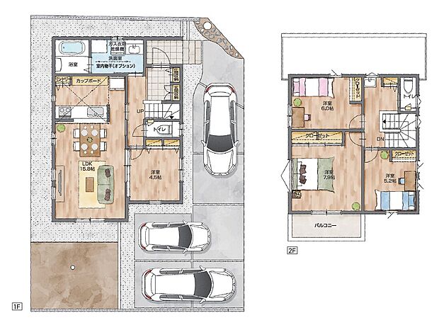 - 「建築条件付き土地」の「建物プラン例」は、土地購入者の設計プランの一例であり、プランの採用可否は任意です。