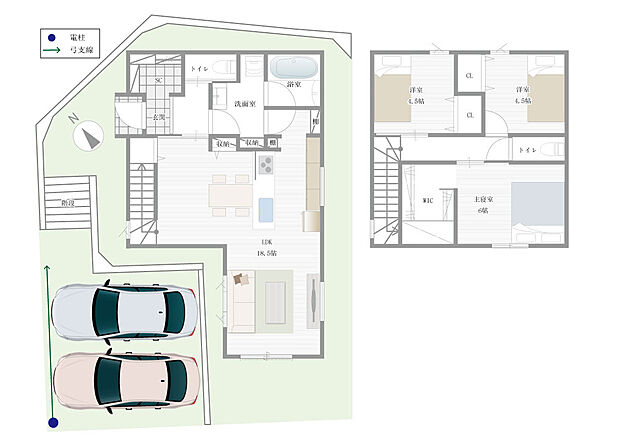 • 「建築条件付き土地」の「建物プラン例」は、土地購入者の設計プランの一例であり、プランの採用可否は任意です。