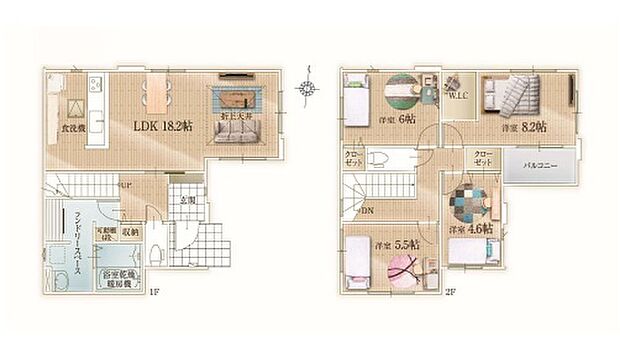 | 間取り | 4LDK 間取り内訳:リビングダイニングキッチン 18.2帖・洋室 8.2帖・洋室 6帖・洋室 5.5帖・洋室 4.6帖 |