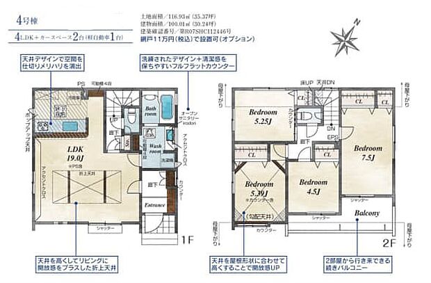 間取り内訳:リビングダイニングキッチン 19帖(1階)・洋室 5.2帖(2階)・洋室 5.3帖(2階)・洋室 4.5帖(2階)・洋室 7.5帖(2階)