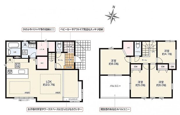 | 間取り | 4LDK 間取り内訳:リビングダイニングキッチン 23.7帖(1階)・洋室 8帖(2階)・洋室 6帖(2階)・洋室 5帖(2階)・洋室 4.1帖(2階) |