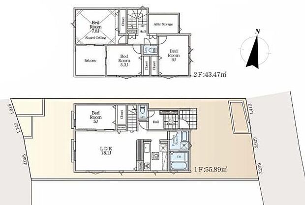 | 間取り | 4LDK 間取り内訳:リビングダイニングキッチン 18.1帖(1階)・洋室 5帖(1階)・洋室 7.8帖(2階)・洋室 5.3帖(2階)・洋室 6帖(2階) |