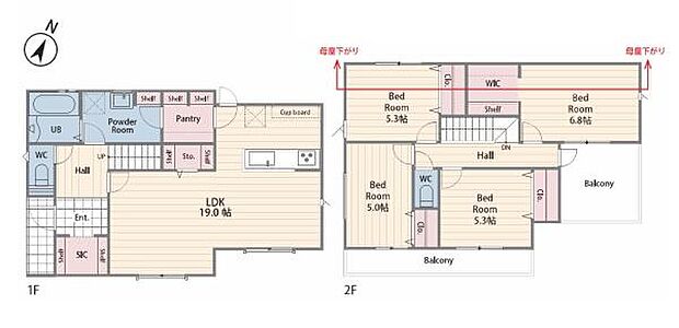 | 間取り | 4LDK 間取り内訳:リビングダイニングキッチン 19帖(1階)・洋室 5.3帖(2階)・洋室 5帖(2階)・洋室 5.3帖(2階)・洋室 6.8帖(2階) |