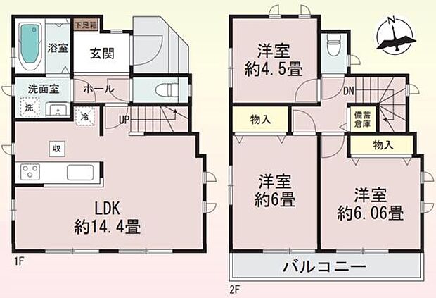 | 間取り | 3LDK 間取り内訳:リビングダイニングキッチン 14.4帖(1階)・洋室 6帖(2階)・洋室 6帖(2階)・洋室 4.5帖(2階) |