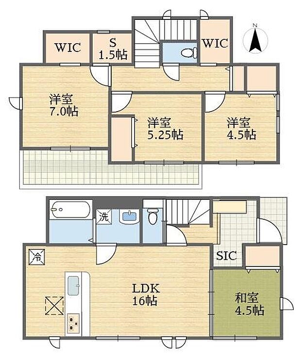 | 間取り | 4SLDK 間取り内訳:リビングダイニングキッチン 16帖(1階)・和室 4.5畳(1階)・洋室 7帖(2階)・洋室 5.2帖(2階)・洋室 4.5帖(2階)・収納 1.5帖(2階) |
