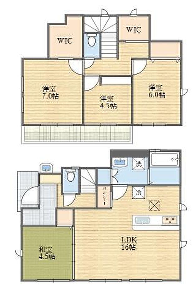 | 間取り | 4LDK 間取り内訳:リビングダイニングキッチン 16帖(1階)・和室 4.5畳(1階)・洋室 7帖(2階)・洋室 4.5帖(2階)・洋室 6帖(2階) |