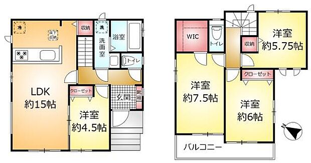 | 間取り | 4LDK 間取り内訳:リビングダイニングキッチン 15帖(1階)・洋室 4.5帖(1階)・洋室 7.5帖(2階)・洋室 5.7帖(2階)・洋室 6帖(2階) |