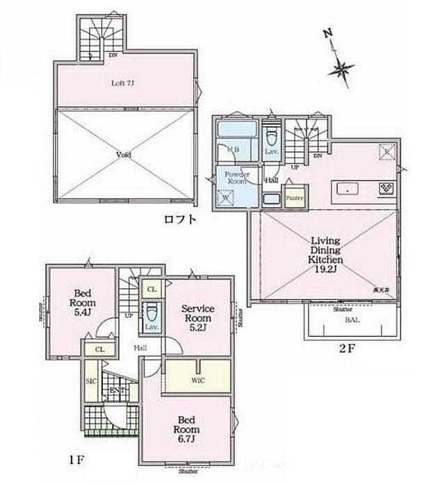 | 間取り | 2SLDK 間取り内訳:収納 5.2帖(1階)・洋室 6.7帖(1階)・洋室 5.4帖(1階)・リビングダイニングキッチン 19.2帖(2階) |