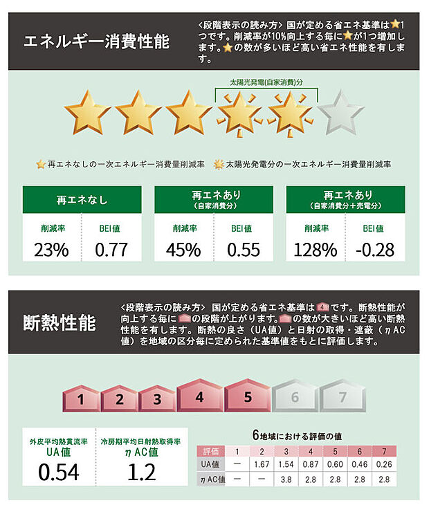 - 星マークの数が多いほどエネルギー消費性能が高いことを示しています。再エネ設備のない住宅は★0~★4の5段階評価、再エネ設備がある住宅は★0~★6の7段階評価となります。