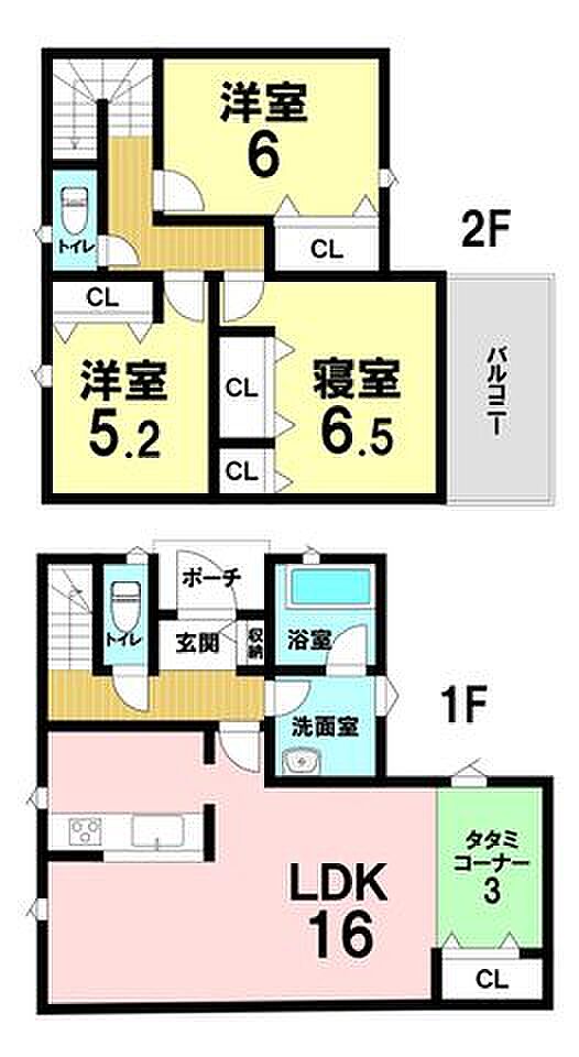 | 間取り | 3LDK 間取り内訳:リビングダイニングキッチン 16帖(1階)・洋室 6.5帖(2階)・洋室 6帖(2階)・洋室 5.2帖(2階) |