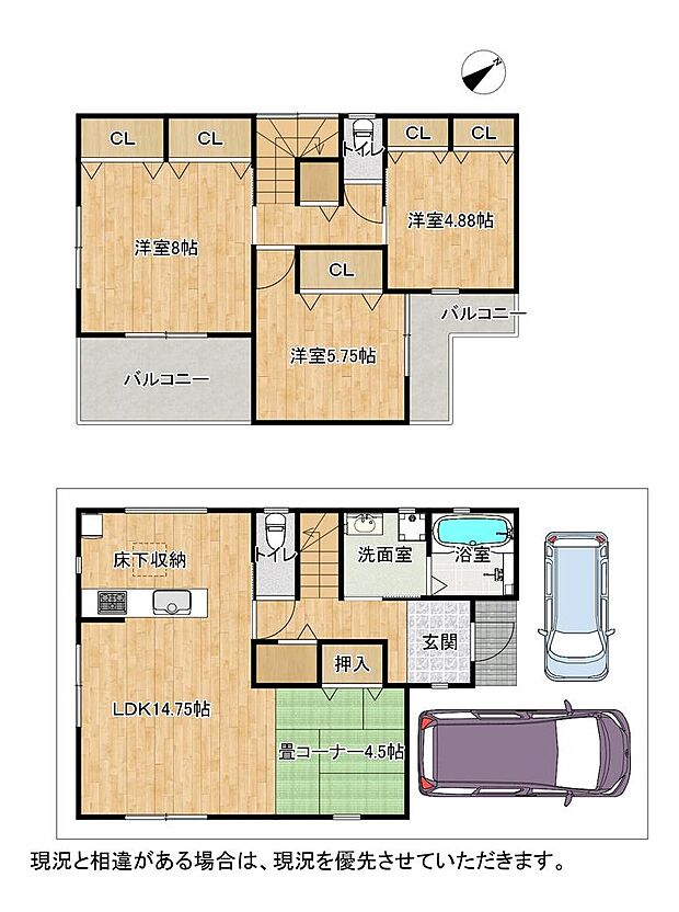 間取り内訳:リビングダイニングキッチン 19.2帖(1階)・洋室 8帖(2階)・洋室 5.7帖(2階)・洋室 4.8帖(2階)