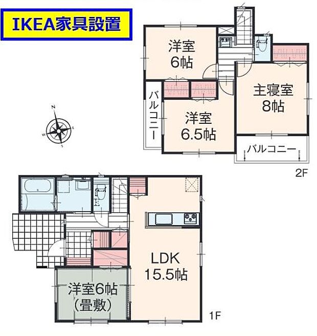 | 間取り | 4LDK 間取り内訳:リビングダイニングキッチン 15.5帖(1階)・洋室 6帖(1階)・洋室 8帖(2階)・洋室 6.5帖(2階)・洋室 6帖(2階) |