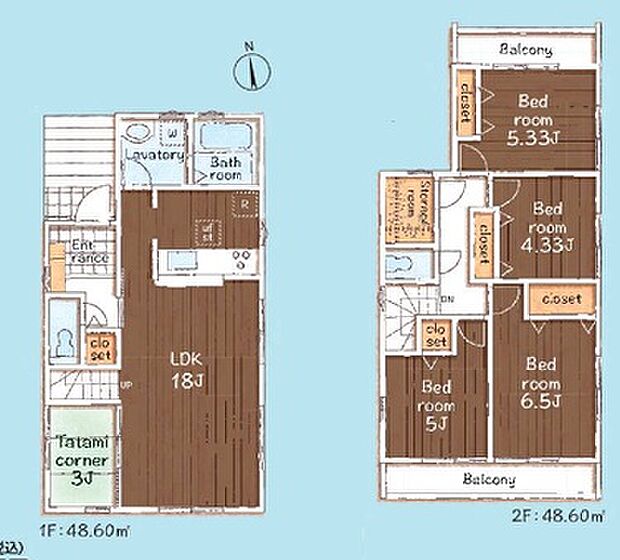 | 間取り | 4SLDK 間取り内訳:リビングダイニングキッチン 18帖(1階)・和室 3畳(1階)x2・洋室 5帖(2階)・洋室 6.5帖(2階)x2・洋室 4.3帖(2階)x3・洋室 5.3帖(2階)x4 |