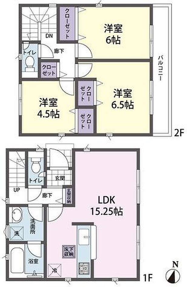 | 間取り | 3LDK 間取り内訳:リビングダイニングキッチン 15.2帖(1階)・洋室 6.5帖(2階)・洋室 6帖(2階)・洋室 4.5帖(2階) |