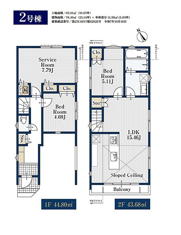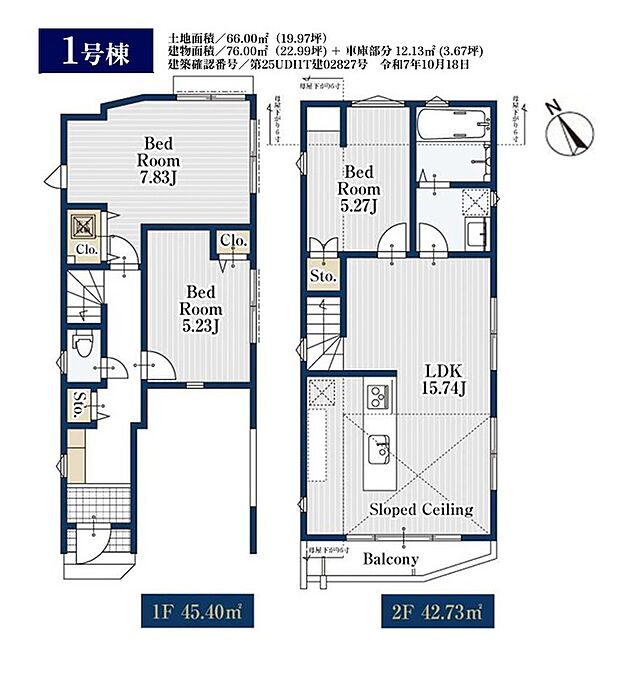 | 建物面積 | 76.00m2+車庫部分12.13m2・76.49m2+車庫部分11.99m2 | ||