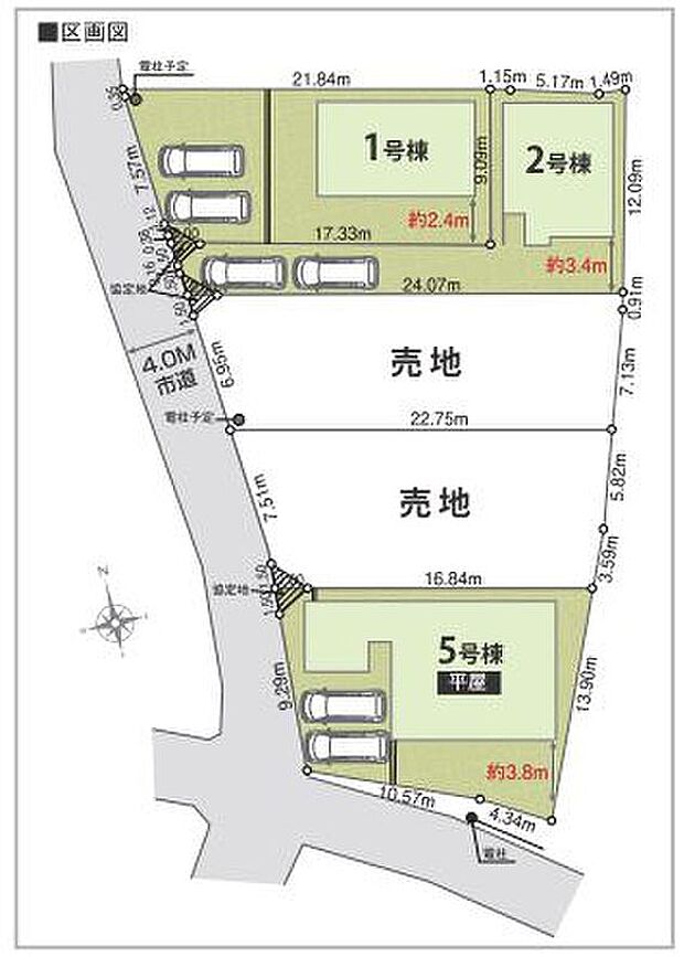1・2号棟が2階建て、5号棟が平屋建ての3区画が建売販売中です