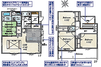 | 間取り | 4LDK 間取り内訳:リビングダイニングキッチン 17帖(1階)・和室 4.5畳(1階)・洋室 5.2帖(2階)x2・洋室 7帖(2階) |