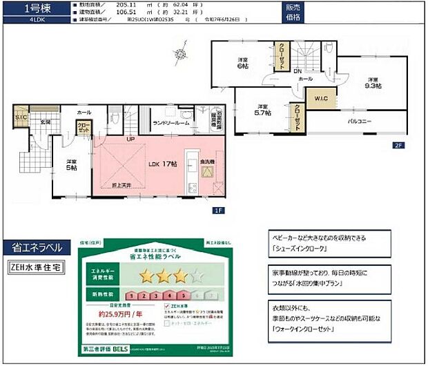 | 間取り | 4LDK 間取り内訳:リビングダイニングキッチン 17帖(1階)・洋室 5帖(1階)・洋室 9.3帖(2階)・洋室 5.7帖(2階)・洋室 6帖(2階) |