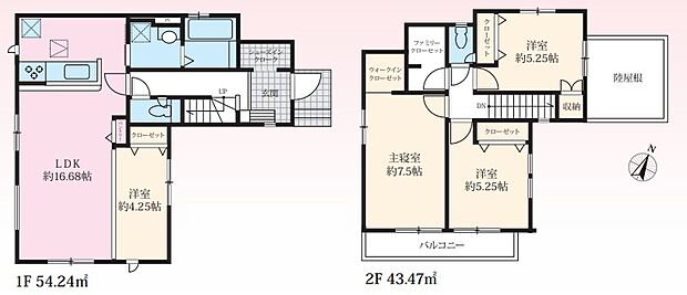 間取り内訳:リビングダイニングキッチン 16.6帖(1階)・洋室 4.2帖(1階)・洋室 5.2帖(2階)x2・洋室 7.5帖(2階)