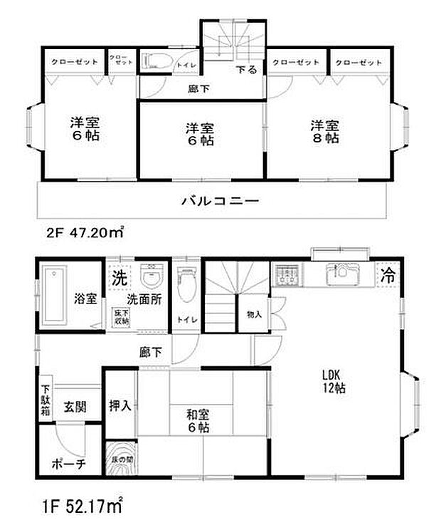 | 間取り | 4LDK 間取り内訳:リビングダイニングキッチン 12帖(1階)・和室 6畳(1階)・洋室 8帖(2階)・洋室 6帖(2階)・洋室 6帖(2階) |