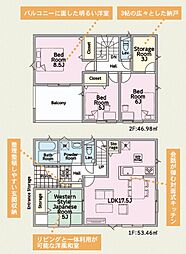 | 間取り | 4LDK 間取り内訳:リビングダイニングキッチン 15.6帖(1階)・和室 6畳(1階)・洋室 8帖(2階)・洋室 6帖(2階)・洋室 6帖(2階) |