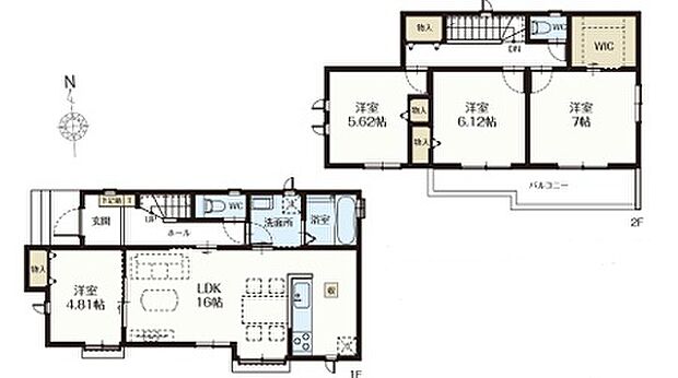 | 間取り | 4LDK 間取り内訳:リビングダイニングキッチン 16帖(1階)・洋室 4.8帖(1階)・洋室 7帖(2階)・洋室 6.1帖(2階)・洋室 5.6帖(2階) |