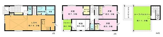 | 間取り | 3LDK 間取り内訳:リビングダイニングキッチン 19.3帖(1階)・洋室 7.5帖(2階)・洋室 5.5帖(2階)・洋室 5.3帖(2階) |