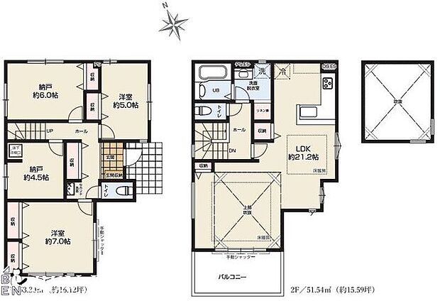 | 間取り | 2SLDK 間取り内訳:リビングダイニングキッチン 21.2帖(2階)・洋室 7帖(1階)・洋室 5帖(1階)・収納 6帖(1階)・収納 4.5帖(1階) |