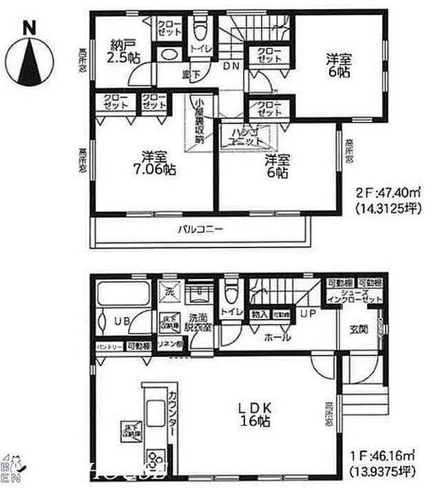 | 間取り | 3SLDK 間取り内訳:リビングダイニングキッチン 16帖(1階)・洋室 7帖(2階)・洋室 6帖(2階)・洋室 6帖(2階)・収納 2.5帖(2階) |