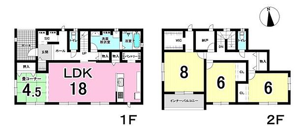 間取り内訳:リビングダイニングキッチン 18帖・和室 4.5畳・洋室 8帖・洋室 6帖・洋室 6帖・収納 2帖