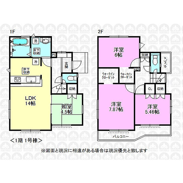 LDK約14帖に対面キッチンで通風良好/ウォークインクローゼット2箇所/カースペース2台(車種による)