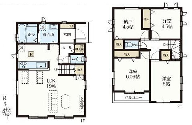 間取り内訳:リビングダイニングキッチン 19帖・洋室 6帖・洋室 6帖・洋室 4.5帖・収納 4.5帖