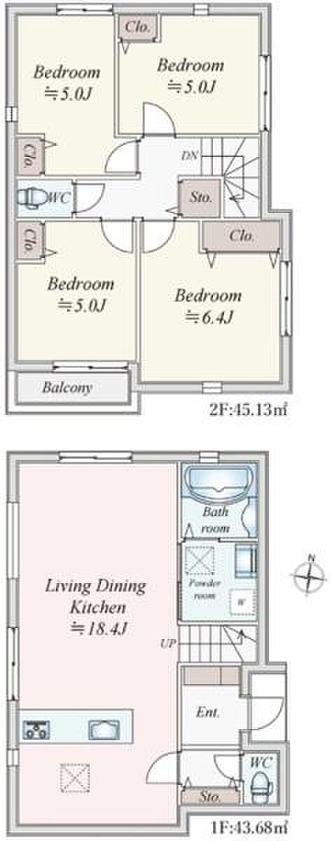| 間取り | 4LDK 間取り内訳:リビングダイニングキッチン 18.4帖(1階)・洋室 6.4帖(2階)・洋室 5帖(2階)・洋室 5帖(2階)・洋室 5帖(2階) |