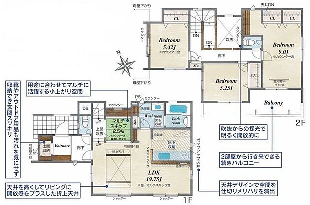 ■駐車スペース3台分■土間収納■吹抜け■カウンター付き畳コーナー■対面式キッチン■主寝室にクローゼット2つ■2部屋続きのバルコニー
