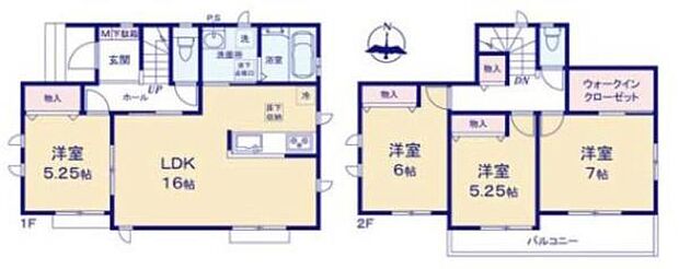| 間取り | 4LDK 間取り内訳:洋室 7帖(2階)・洋室 5.2帖(1階)・リビングダイニングキッチン 16帖(1階)・洋室 6帖(2階)・洋室 5.2帖(2階) |