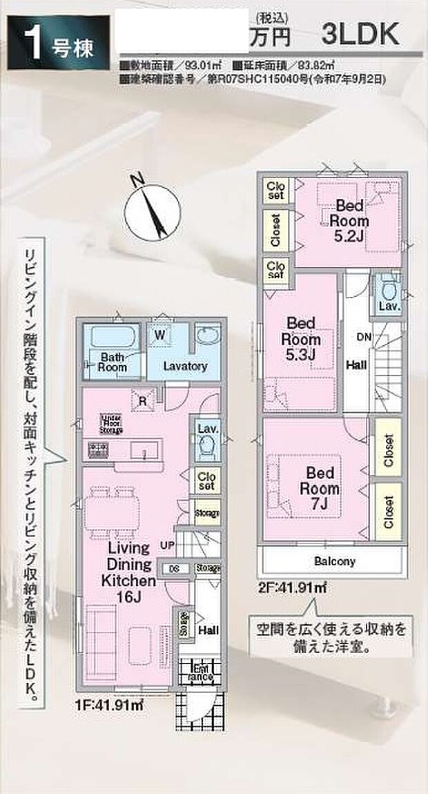 | 間取り | 3LDK 間取り内訳:リビングダイニングキッチン 16帖(1階)・洋室 5.2帖(2階)・洋室 5.3帖(2階)・洋室 7帖(2階) |