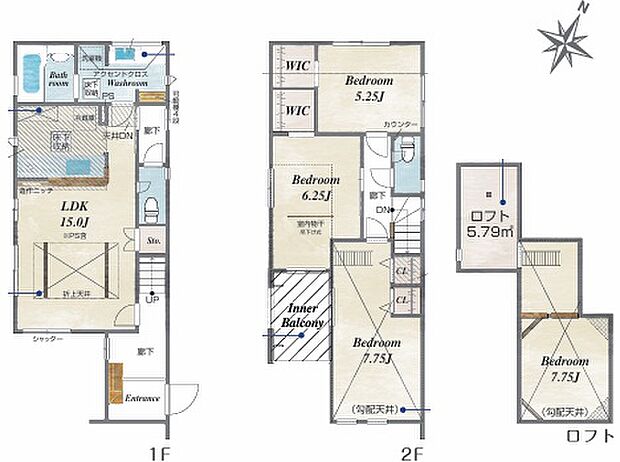 間取り内訳:リビングダイニングキッチン 15帖(1階)・洋室 5.2帖(2階)・洋室 6.2帖(2階)・洋室 7.7帖(2階)x2