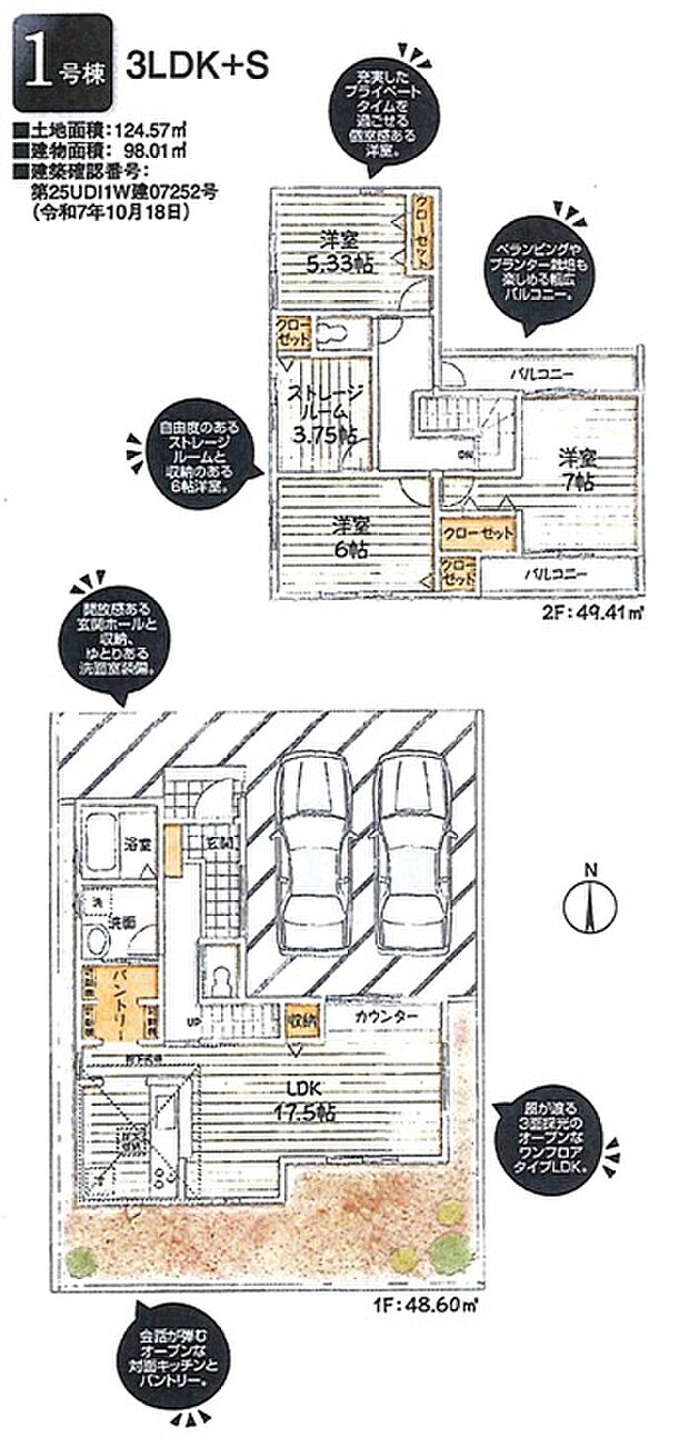 | 間取り | 3SLDK 間取り内訳:リビングダイニングキッチン 17.5帖(1階)・洋室 5.3帖(2階)・洋室 6帖(2階)・洋室 7帖(2階)・収納 3.7帖(2階) |