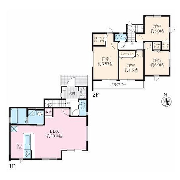 | 間取り | 4LDK 間取り内訳:リビングダイニングキッチン 20帖(1階)・洋室 6.8帖(2階)・洋室 4.5帖(2階)・洋室 5帖(2階)・洋室 5帖(2階) |