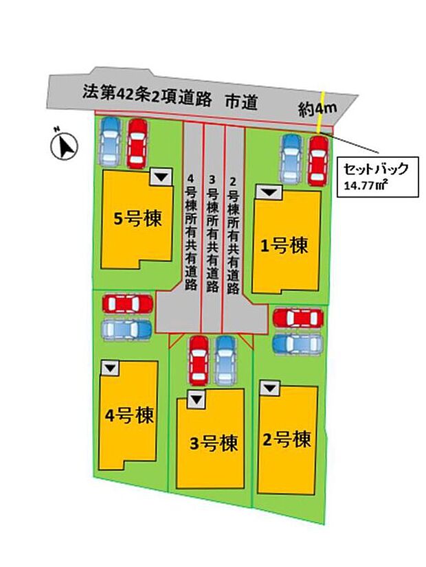 | 建ぺい率 / 容積率 | 建ぺい率:1号棟70%・2~5号棟60%、容積率:150% | ||