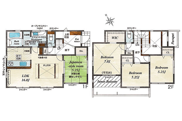 | 間取り | 4LDK 間取り内訳:リビングダイニングキッチン 16帖(1階)・和室 5.2畳(1階)・洋室 7帖(2階)・洋室 5.2帖(2階)x2 |