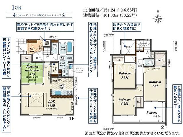 | 間取り | 4LDK 間取り内訳:リビングダイニングキッチン 18帖(1階)・和室 4.5畳(1階)・洋室 5.2帖(2階)・洋室 5.2帖(2階)・洋室 7帖(2階) |
