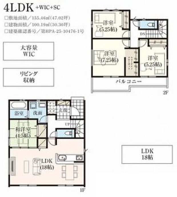 間取り内訳:リビングダイニングキッチン 18帖(1階)・和室 4.5畳(1階)・洋室 7.3帖(2階)・洋室 5.3帖(2階)・洋室 5.3帖(2階)