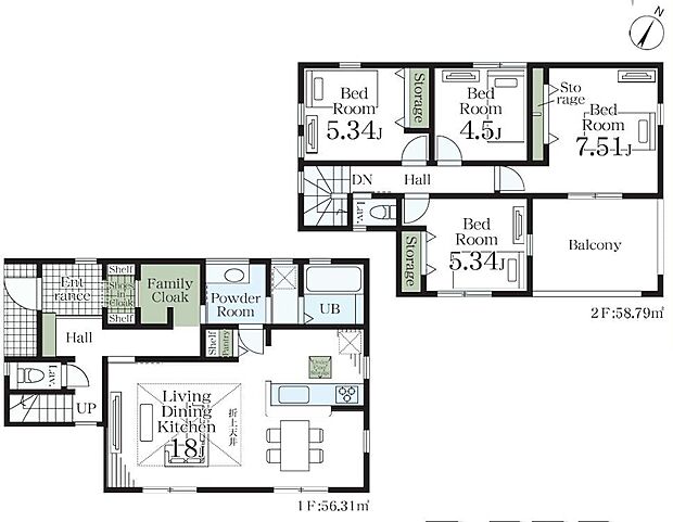 敷地面積は広々55坪 開放感溢れる折上天井付きのLDKはゆとりある18帖 お車は並列2台駐車可能です