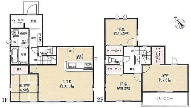 | 間取り | 4LDK 間取り内訳:リビングダイニングキッチン 16.5帖(1階)・和室 4.5畳(1階)・洋室 7.5帖(2階)・洋室 6帖(2階)・洋室 5.2帖(2階) |