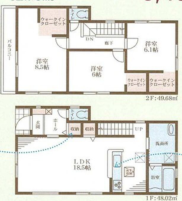 | 間取り | 3LDK 間取り内訳:リビングダイニングキッチン 18.5帖(1階)・洋室 6帖(1階)・洋室 6.1帖(2階)・洋室 8.5帖(2階) |