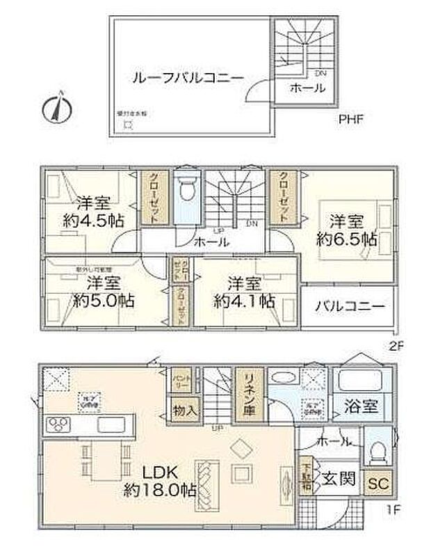 | 間取り | 4LDK 間取り内訳:リビングダイニングキッチン 18帖(1階)・洋室 4.5帖(2階)・洋室 5帖(2階)・洋室 4.1帖(2階)・洋室 6.5帖(2階) |