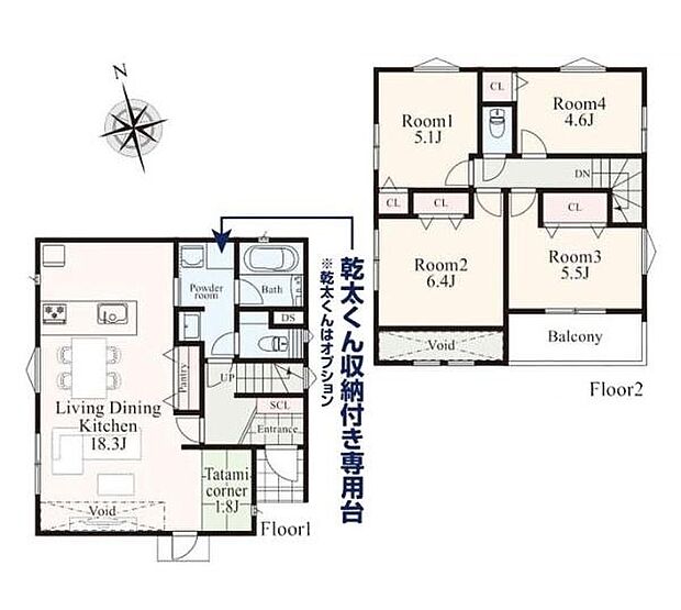 | 間取り | 4LDK 間取り内訳:リビングダイニングキッチン 18.3帖(1階)・洋室 5.1帖(2階)・洋室 6.4帖(2階)・洋室 5.5帖(2階)・洋室 4.6帖(2階) |