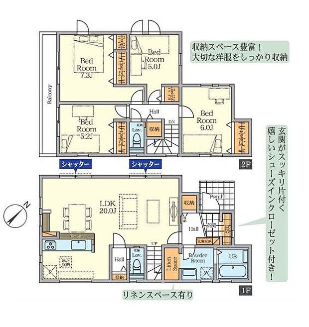 | 間取り | 4LDK 間取り内訳:リビングダイニングキッチン 20帖(1階)・洋室 7.3帖(2階)・洋室 5.2帖(2階)・洋室 6帖(2階)・洋室 5帖(2階) |