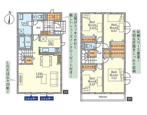 | 間取り | 4LDK 間取り内訳:リビングダイニングキッチン 20帖(1階)・洋室 5.2帖(2階)・洋室 5.2帖(2階)・洋室 7.5帖(2階)・洋室 6.5帖(2階) |